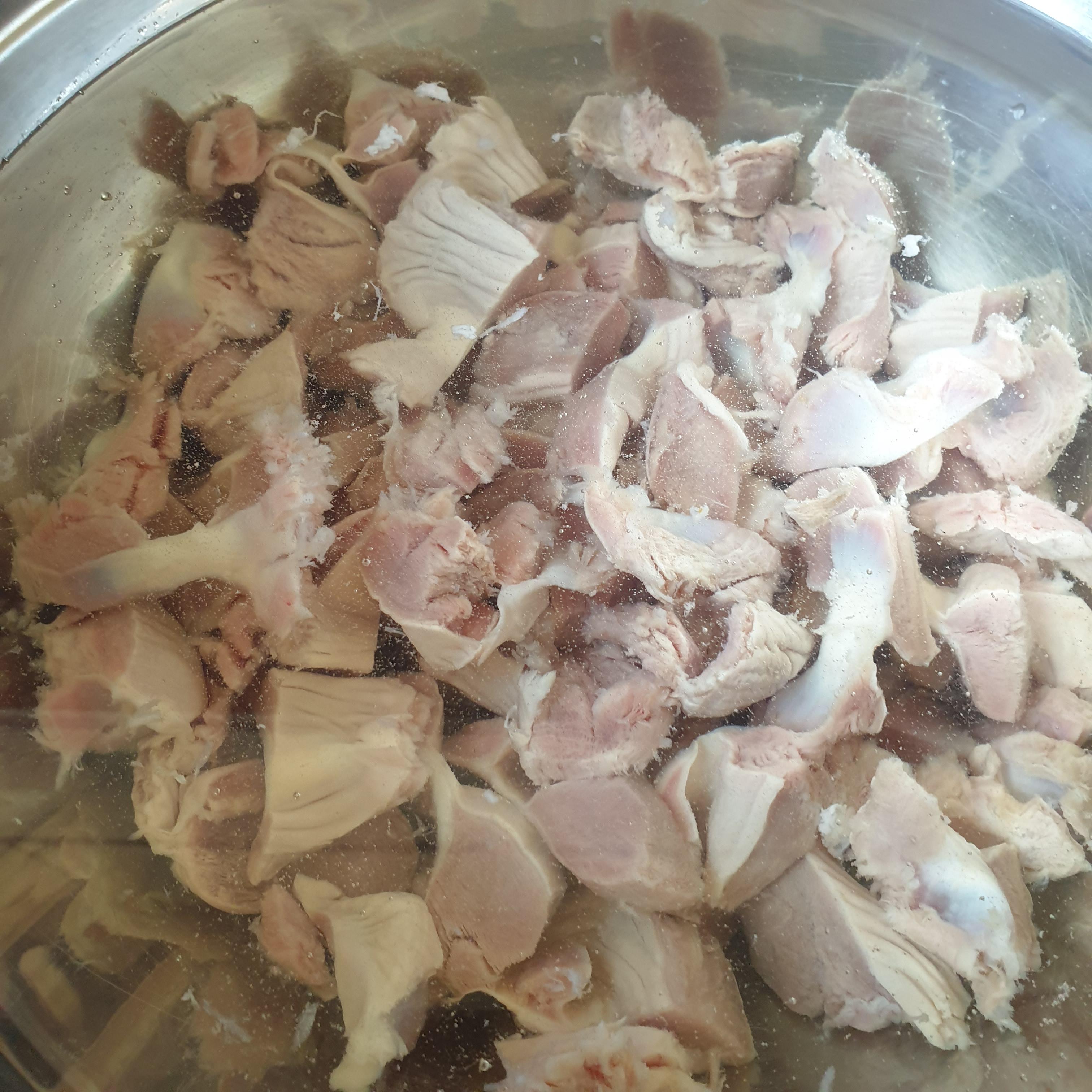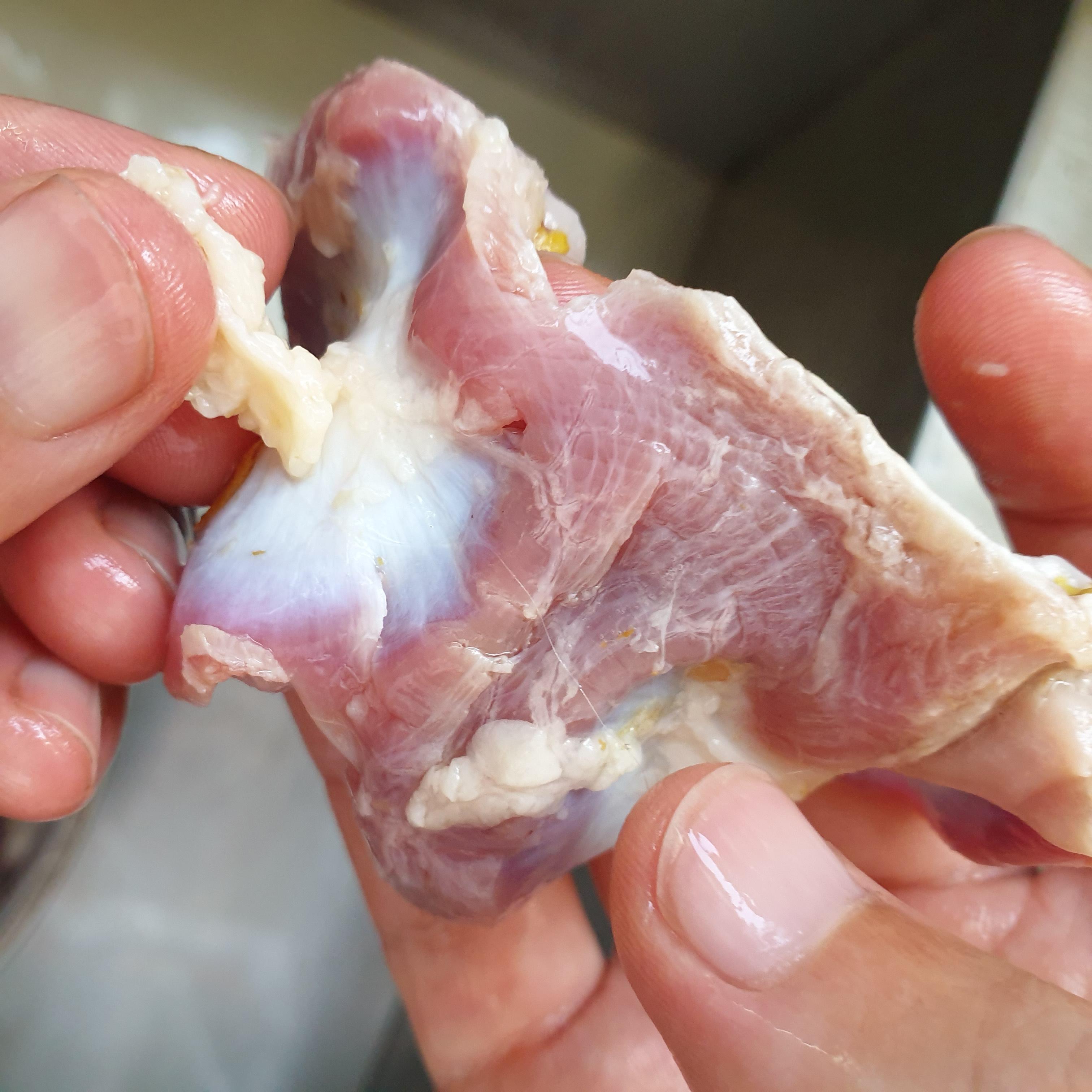 ≪Step 2≫ 흐르는 물에 닭근위를 씻어주면서 주변에 붙어있는 지방과 이물질을 제거해주세요. 다이어트에 좋은 간식인데 지방이 붙어 있으면 제대로 된 효과를 볼 수 없겠죠.