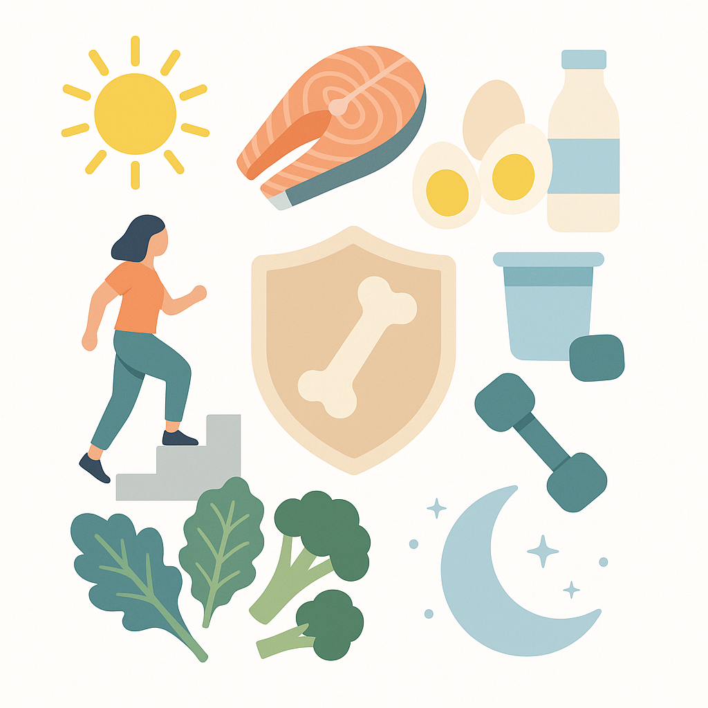 7 hours of sleep + fixed wake-up time stabilizes bone remodeling rhythms. Moderate drinking, smoking cessation, and weight management reduce factors increasing bone resorption, helping maintain bone density. Dim lights and screens 90 minutes before bed and set bedroom temperature to 18–20°C.