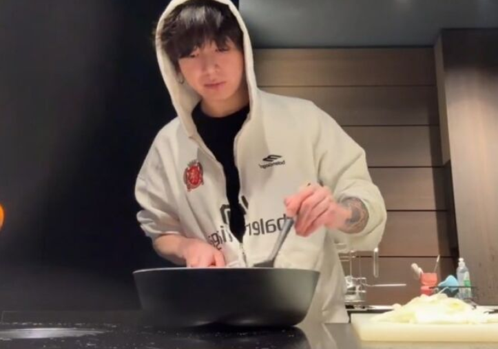 While engrossed in cooking, Jungkook suddenly asked off-camera, “What time did you sleep last night?” A male voice replied, “1 AM? 2 AM? Since today's my day off,” instantly capturing viewers' attention.
