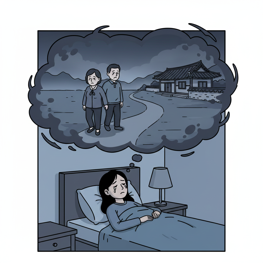 A dream where your deceased parents appear silently, gazing at you only with a worried or sad expression is a strong warning message of serious danger or misfortune. Your parents' heavy expression signifies that a major calamity or problem is approaching your current life, which could manifest as business failure, deteriorating health, or family discord.