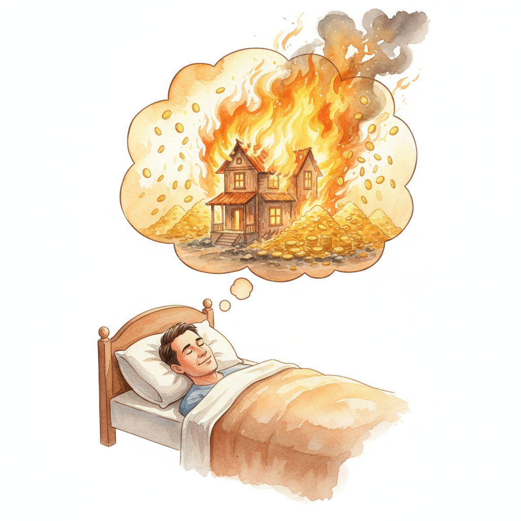 A dream where the house or building you live in burns fiercely until only ashes remain is interpreted as the most powerful auspicious dream among fire dreams, hinting at the accumulation of immense wealth alongside family peace. The house symbolizes your business foundation and the entire family lineage. Everything burning signifies that existing old problems and worries are completely extinguished, marking the beginning of a new dimension of great success.